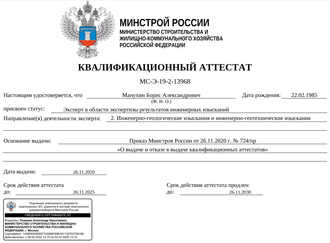 Вчера получил квалификационный аттестат о продлении до конца 2030г. аттестата по направлению » Инженерно-геологические изыскания и инженерно-геотехнические изыскания».